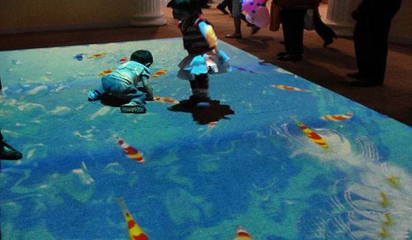 1、互動魚池:水池是投影畫面,顯示出的影像是魚在水中游動,當(dāng)人們從投影區(qū)域內(nèi)走過時,水面會出現(xiàn)水波紋的 效果,而且魚兒也會及時的避開。