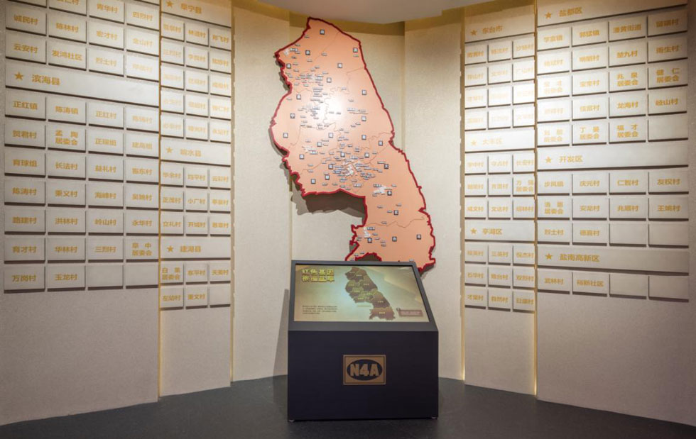 鹽城新四軍紀(jì)念館是全國唯一的專業(yè)性新四軍紀(jì)念館。醒目的藍(lán)白相間的“N4A”臂章圖案,鑲嵌在展廳正門上方,兩側(cè)旗形的花崗石陰雕畫,藝術(shù)地再現(xiàn)了新四軍與八路軍在白駒獅子口勝利會(huì)師和皖南事變后新四軍在鹽城重建軍部的歷史場(chǎng)面。