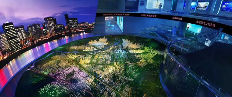 能展現城市中的建筑物、軌道交通、花草樹木、四季變化以及未來發展等信息,沙盤制作技術人員利用計算機中的沙盤制作軟件結合沙盤技術制作而成的內容,通過投影投射到屏幕上展現。